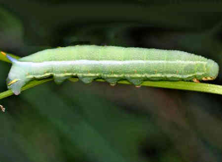 Phénologie de la chenille : juillet à septembre. De grande taille, la chenille présente une superbe robe vert pâle ou rose, rehaussée d'une ligne latérale blanche s'étendant tout le long de l'abdomen jusqu'à la come ; cette dernière est de petite taille et recourbée. En outre, on distingue une grande tache ocellée, noire, pupillée de bleu, sur le troisième segment thoracique, et de nombreux petits points granuleux blancs sur l'abdomen. La nymphose a lieu au niveau du sol.