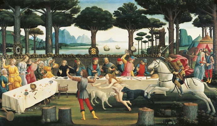 8) Nastagio degli Onesti aimant une dame de la famille des Traversari, depense toute sa fortune sans parvenir à se faire aimer. Sur les instituées des siens, il s’en va à Chiashi. Là, il voit un chevalier donner la chasse à une jeune femme, la tuer et la donner à dévorer à deux chiens. Il invite à déjeuner ses parents et la dame qu’il aime, et celle-ci voit la même jeune femme subir le susdit supplice. Craignant qu’il ne lui en arrive autant, elle consent à prendre Nastagio pour mari.